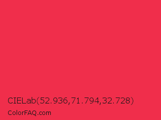 CIELab 52.936,71.794,32.728 Color is a normal red color and the nearest color is Amaranth #e52b50. Hex code #f02e4b and RGB value is rgb(240,46,75). In RGB color space, this color is composed of 94% red, 18% green, 29% blue, In CMYK color space, this color is composed of 0% cyan, 81% magenta, 69% yellow , 6% black , In HSL color space, this color has a hue angle of 351° , 87% saturation and 56% lightness.
