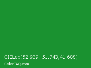 CIELab 52.939,-51.743,41.688 Color is a normal green color and the nearest color is Forest Green #228b22. Hex code #1a9230 and RGB value is rgb(26,146,48). In RGB color space, this color is composed of 10% red, 57% green, 19% blue, In CMYK color space, this color is composed of 82% cyan, 0% magenta, 67% yellow , 43% black , In HSL color space, this color has a hue angle of 131° , 70% saturation and 34% lightness.