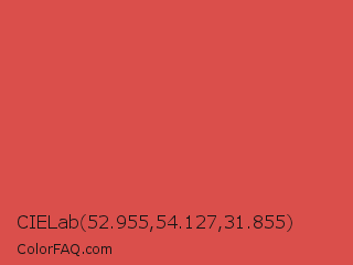 CIELab 52.955,54.127,31.855 Color is a normal red color and the nearest color is English Vermillion #cc474b. Hex code #da4f4b and RGB value is rgb(218,79,75). In RGB color space, this color is composed of 85% red, 31% green, 29% blue, In CMYK color space, this color is composed of 0% cyan, 64% magenta, 66% yellow , 15% black , In HSL color space, this color has a hue angle of 2° , 66% saturation and 57% lightness.