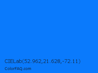 CIELab 52.962,21.628,-72.11 Color is a normal blue color and the nearest color is Azure Radiance #007fff. Hex code #0a7afc and RGB value is rgb(10,122,252). In RGB color space, this color is composed of 4% red, 48% green, 99% blue, In CMYK color space, this color is composed of 96% cyan, 52% magenta, 0% yellow , 1% black , In HSL color space, this color has a hue angle of 212° , 98% saturation and 51% lightness.