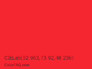 CIELab 52.963,73.92,48.236 Color is a normal red color and the nearest color is Imperial Red #ed2939. Hex code #f52630 and RGB value is rgb(245,38,48). In RGB color space, this color is composed of 96% red, 15% green, 19% blue, In CMYK color space, this color is composed of 0% cyan, 84% magenta, 80% yellow , 4% black , In HSL color space, this color has a hue angle of 357° , 91% saturation and 55% lightness.