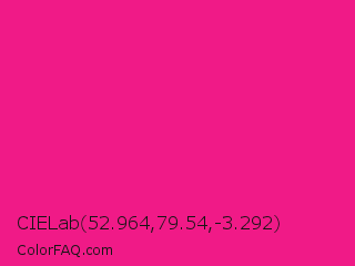 CIELab 52.964,79.54,-3.292 Color is a normal rose color and the nearest color is Barbie Pink #e0218a. Hex code #f01a87 and RGB value is rgb(240,26,135). In RGB color space, this color is composed of 94% red, 10% green, 53% blue, In CMYK color space, this color is composed of 0% cyan, 89% magenta, 44% yellow , 6% black , In HSL color space, this color has a hue angle of 329° , 88% saturation and 52% lightness.