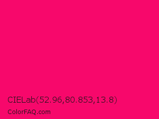 CIELab 52.96,80.853,13.8 Color is a normal rose color and the nearest color is Vivid Raspberry #ff006c. Hex code #f7086b and RGB value is rgb(247,8,107). In RGB color space, this color is composed of 97% red, 3% green, 42% blue, In CMYK color space, this color is composed of 0% cyan, 97% magenta, 57% yellow , 3% black , In HSL color space, this color has a hue angle of 335° , 94% saturation and 50% lightness.