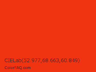 CIELab 52.977,68.663,60.849 Color is a normal red color and the nearest color is Red RYB #fe2712. Hex code #f03412 and RGB value is rgb(240,52,18). In RGB color space, this color is composed of 94% red, 20% green, 7% blue, In CMYK color space, this color is composed of 0% cyan, 78% magenta, 93% yellow , 6% black , In HSL color space, this color has a hue angle of 9° , 88% saturation and 51% lightness.