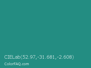 CIELab 52.97,-31.681,-2.608 Color is a normal cyan color and the nearest color is Lochinvar #2c8c84. Hex code #238d82 and RGB value is rgb(35,141,130). In RGB color space, this color is composed of 14% red, 55% green, 51% blue, In CMYK color space, this color is composed of 75% cyan, 0% magenta, 8% yellow , 45% black , In HSL color space, this color has a hue angle of 174° , 60% saturation and 35% lightness.