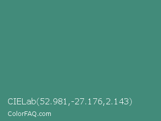 CIELab 52.981,-27.176,2.143 Color is a normal cyan color and the nearest color is Viridian #40826d. Hex code #428b7a and RGB value is rgb(66,139,122). In RGB color space, this color is composed of 26% red, 55% green, 48% blue, In CMYK color space, this color is composed of 53% cyan, 0% magenta, 12% yellow , 45% black , In HSL color space, this color has a hue angle of 166° , 36% saturation and 40% lightness.