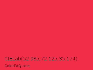 CIELab 52.985,72.125,35.174 Color is a normal red color and the nearest color is Red Crayola #ee204d. Hex code #f12d47 and RGB value is rgb(241,45,71). In RGB color space, this color is composed of 95% red, 18% green, 28% blue, In CMYK color space, this color is composed of 0% cyan, 81% magenta, 71% yellow , 5% black , In HSL color space, this color has a hue angle of 352° , 88% saturation and 56% lightness.