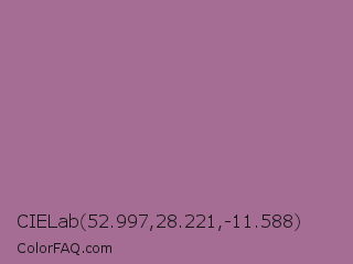 CIELab 52.997,28.221,-11.588 Color is a normal magenta color and the nearest color is Mountbatten Pink #997a8d. Hex code #a56d93 and RGB value is rgb(165,109,147). In RGB color space, this color is composed of 65% red, 43% green, 58% blue, In CMYK color space, this color is composed of 0% cyan, 34% magenta, 11% yellow , 35% black , In HSL color space, this color has a hue angle of 319° , 24% saturation and 54% lightness.