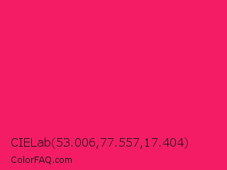 CIELab 53.006,77.557,17.404 Color is a normal rose color and the nearest color is Razzmatazz #e3256b. Hex code #f41d65 and RGB value is rgb(244,29,101). In RGB color space, this color is composed of 96% red, 11% green, 40% blue, In CMYK color space, this color is composed of 0% cyan, 88% magenta, 59% yellow , 4% black , In HSL color space, this color has a hue angle of 340° , 91% saturation and 54% lightness.