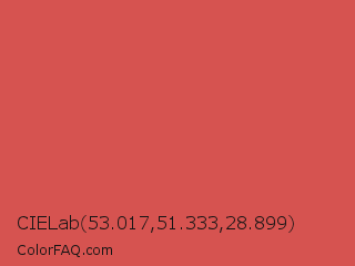 CIELab 53.017,51.333,28.899 Color is a normal red color and the nearest color is Jelly Bean #da614e. Hex code #d65350 and RGB value is rgb(214,83,80). In RGB color space, this color is composed of 84% red, 33% green, 31% blue, In CMYK color space, this color is composed of 0% cyan, 61% magenta, 63% yellow , 16% black , In HSL color space, this color has a hue angle of 1° , 62% saturation and 58% lightness.