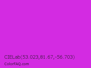 CIELab 53.023,81.67,-56.703 Color is a normal magenta color and the nearest color is Steel Pink #cc33cc. Hex code #d32be2 and RGB value is rgb(211,43,226). In RGB color space, this color is composed of 83% red, 17% green, 89% blue, In CMYK color space, this color is composed of 7% cyan, 81% magenta, 0% yellow , 11% black , In HSL color space, this color has a hue angle of 295° , 76% saturation and 53% lightness.