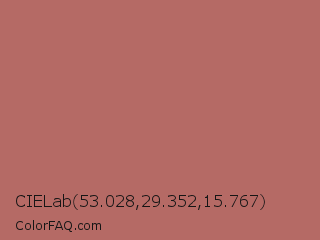CIELab 53.028,29.352,15.767 Color is a normal red color and the nearest color is Copper Penny #ad6f69. Hex code #b56a65 and RGB value is rgb(181,106,101). In RGB color space, this color is composed of 71% red, 42% green, 40% blue, In CMYK color space, this color is composed of 0% cyan, 41% magenta, 44% yellow , 29% black , In HSL color space, this color has a hue angle of 4° , 35% saturation and 55% lightness.