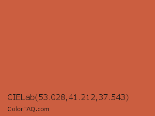 CIELab 53.028,41.212,37.543 Color is a normal red color and the nearest color is Dark Coral #cd5b45. Hex code #cb5e40 and RGB value is rgb(203,94,64). In RGB color space, this color is composed of 80% red, 37% green, 25% blue, In CMYK color space, this color is composed of 0% cyan, 54% magenta, 68% yellow , 20% black , In HSL color space, this color has a hue angle of 13° , 57% saturation and 52% lightness.