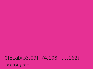 CIELab 53.031,74.108,-11.162 Color is a normal magenta color and the nearest color is Cerise #da3287. Hex code #e63094 and RGB value is rgb(230,48,148). In RGB color space, this color is composed of 90% red, 19% green, 58% blue, In CMYK color space, this color is composed of 0% cyan, 79% magenta, 36% yellow , 10% black , In HSL color space, this color has a hue angle of 327° , 78% saturation and 55% lightness.