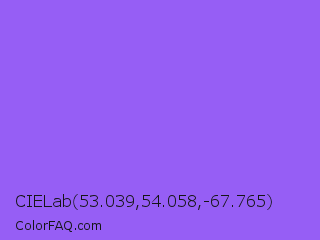 CIELab 53.039,54.058,-67.765 Color is a light violet color and the nearest color is Navy Purple #9457eb. Hex code #965ef5 and RGB value is rgb(150,94,245). In RGB color space, this color is composed of 59% red, 37% green, 96% blue, In CMYK color space, this color is composed of 39% cyan, 62% magenta, 0% yellow , 4% black , In HSL color space, this color has a hue angle of 262° , 88% saturation and 66% lightness.