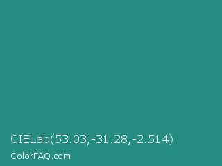 CIELab 53.03,-31.28,-2.514 Color is a normal cyan color and the nearest color is Lochinvar #2c8c84. Hex code #268d82 and RGB value is rgb(38,141,130). In RGB color space, this color is composed of 15% red, 55% green, 51% blue, In CMYK color space, this color is composed of 73% cyan, 0% magenta, 8% yellow , 45% black , In HSL color space, this color has a hue angle of 174° , 58% saturation and 35% lightness.