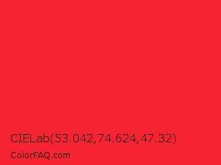 CIELab 53.042,74.624,47.32 Color is a normal red color and the nearest color is Imperial Red #ed2939. Hex code #f62432 and RGB value is rgb(246,36,50). In RGB color space, this color is composed of 96% red, 14% green, 20% blue, In CMYK color space, this color is composed of 0% cyan, 85% magenta, 80% yellow , 4% black , In HSL color space, this color has a hue angle of 356° , 92% saturation and 55% lightness.
