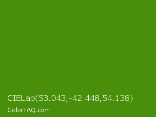 CIELab 53.043,-42.448,54.138 Color is a dark green color and the nearest color is Vida Loca #549019. Hex code #498f0b and RGB value is rgb(73,143,11). In RGB color space, this color is composed of 29% red, 56% green, 4% blue, In CMYK color space, this color is composed of 49% cyan, 0% magenta, 92% yellow , 44% black , In HSL color space, this color has a hue angle of 92° , 86% saturation and 30% lightness.