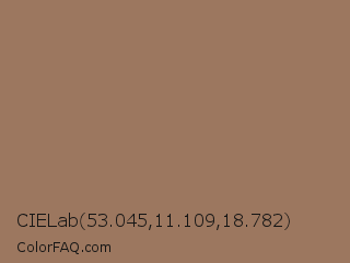 CIELab 53.045,11.109,18.782 Color is a normal orange color and the nearest color is Chamoisee #a0785a. Hex code #9c775f and RGB value is rgb(156,119,95). In RGB color space, this color is composed of 61% red, 47% green, 37% blue, In CMYK color space, this color is composed of 0% cyan, 24% magenta, 39% yellow , 39% black , In HSL color space, this color has a hue angle of 24° , 24% saturation and 49% lightness.