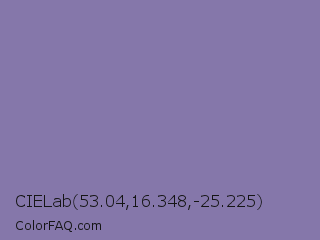 CIELab 53.04,16.348,-25.225 Color is a normal indigo color and the nearest color is Purple Mountains Majesty #9678b6. Hex code #8577aa and RGB value is rgb(133,119,170). In RGB color space, this color is composed of 52% red, 47% green, 67% blue, In CMYK color space, this color is composed of 22% cyan, 30% magenta, 0% yellow , 33% black , In HSL color space, this color has a hue angle of 256° , 23% saturation and 57% lightness.