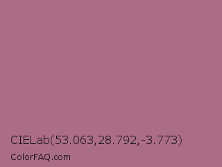 CIELab 53.063,28.792,-3.773 Color is a normal rose color and the nearest color is Turkish Rose #b57281. Hex code #ab6c86 and RGB value is rgb(171,108,134). In RGB color space, this color is composed of 67% red, 42% green, 53% blue, In CMYK color space, this color is composed of 0% cyan, 37% magenta, 22% yellow , 33% black , In HSL color space, this color has a hue angle of 335° , 27% saturation and 55% lightness.
