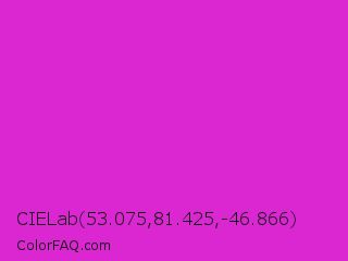 CIELab 53.075,81.425,-46.866 Color is a normal magenta color and the nearest color is Steel Pink #cc33cc. Hex code #db27d1 and RGB value is rgb(219,39,209). In RGB color space, this color is composed of 86% red, 15% green, 82% blue, In CMYK color space, this color is composed of 0% cyan, 82% magenta, 5% yellow , 14% black , In HSL color space, this color has a hue angle of 303° , 71% saturation and 51% lightness.