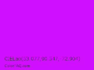 CIELab 53.077,90.547,-72.904 Color is a normal purple color and the nearest color is Vivid Orchid #cc00ff. Hex code #d10fff and RGB value is rgb(209,15,255). In RGB color space, this color is composed of 82% red, 6% green, 100% blue, In CMYK color space, this color is composed of 18% cyan, 94% magenta, 0% yellow , 0% black , In HSL color space, this color has a hue angle of 289° , 100% saturation and 53% lightness.