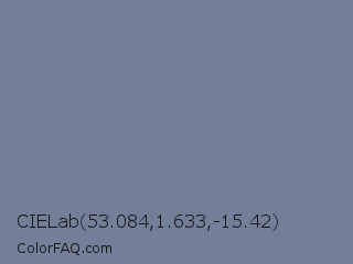 CIELab 53.084,1.633,-15.42 Color is a normal blue color and the nearest color is Slate Gray #708090. Hex code #737f99 and RGB value is rgb(115,127,153). In RGB color space, this color is composed of 45% red, 50% green, 60% blue, In CMYK color space, this color is composed of 25% cyan, 17% magenta, 0% yellow , 40% black , In HSL color space, this color has a hue angle of 221° , 16% saturation and 53% lightness.