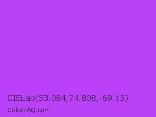 CIELab 53.084,74.808,-69.15 Color is a light purple color and the nearest color is Medium Orchid #ba55d3. Hex code #bb41f8 and RGB value is rgb(187,65,248). In RGB color space, this color is composed of 73% red, 25% green, 97% blue, In CMYK color space, this color is composed of 25% cyan, 74% magenta, 0% yellow , 3% black , In HSL color space, this color has a hue angle of 280° , 93% saturation and 61% lightness.