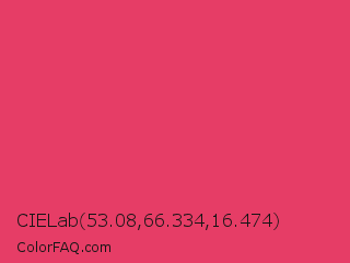 CIELab 53.08,66.334,16.474 Color is a normal red color and the nearest color is Paradise Pink #e63e62. Hex code #e63d66 and RGB value is rgb(230,61,102). In RGB color space, this color is composed of 90% red, 24% green, 40% blue, In CMYK color space, this color is composed of 0% cyan, 73% magenta, 56% yellow , 10% black , In HSL color space, this color has a hue angle of 345° , 77% saturation and 57% lightness.