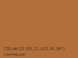 CIELab 53.091,21.625,40.387 Color is a normal orange color and the nearest color is Copper #b87333. Hex code #b26f39 and RGB value is rgb(178,111,57). In RGB color space, this color is composed of 70% red, 44% green, 22% blue, In CMYK color space, this color is composed of 0% cyan, 38% magenta, 68% yellow , 30% black , In HSL color space, this color has a hue angle of 27° , 51% saturation and 46% lightness.