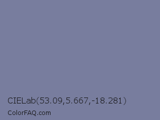 CIELab 53.09,5.667,-18.281 Color is a normal blue color and the nearest color is Waterloo #7b7c94. Hex code #787d9e and RGB value is rgb(120,125,158). In RGB color space, this color is composed of 47% red, 49% green, 62% blue, In CMYK color space, this color is composed of 24% cyan, 21% magenta, 0% yellow , 38% black , In HSL color space, this color has a hue angle of 232° , 16% saturation and 55% lightness.