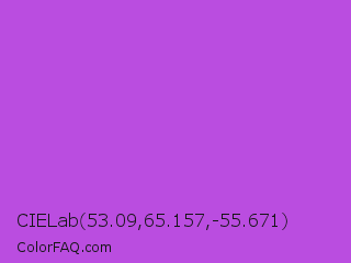 CIELab 53.09,65.157,-55.671 Color is a normal purple color and the nearest color is Medium Orchid #ba55d3. Hex code #ba4de0 and RGB value is rgb(186,77,224). In RGB color space, this color is composed of 73% red, 30% green, 88% blue, In CMYK color space, this color is composed of 17% cyan, 66% magenta, 0% yellow , 12% black , In HSL color space, this color has a hue angle of 284° , 70% saturation and 59% lightness.