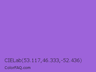 CIELab 53.117,46.333,-52.436 Color is a light violet color and the nearest color is Dark Pastel Purple #966fd6. Hex code #9d63da and RGB value is rgb(157,99,218). In RGB color space, this color is composed of 62% red, 39% green, 85% blue, In CMYK color space, this color is composed of 28% cyan, 55% magenta, 0% yellow , 15% black , In HSL color space, this color has a hue angle of 269° , 62% saturation and 62% lightness.
