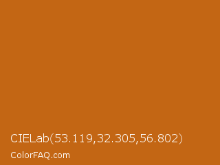CIELab 53.119,32.305,56.802 Color is a normal orange color and the nearest color is Alloy Orange #c46210. Hex code #c36614 and RGB value is rgb(195,102,20). In RGB color space, this color is composed of 76% red, 40% green, 8% blue, In CMYK color space, this color is composed of 0% cyan, 48% magenta, 90% yellow , 24% black , In HSL color space, this color has a hue angle of 28° , 81% saturation and 42% lightness.