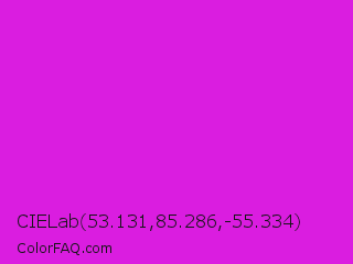 CIELab 53.131,85.286,-55.334 Color is a normal magenta color and the nearest color is Steel Pink #cc33cc. Hex code #da1de0 and RGB value is rgb(218,29,224). In RGB color space, this color is composed of 85% red, 11% green, 88% blue, In CMYK color space, this color is composed of 3% cyan, 87% magenta, 0% yellow , 12% black , In HSL color space, this color has a hue angle of 298° , 77% saturation and 50% lightness.