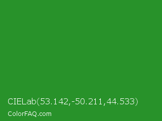 CIELab 53.142,-50.211,44.533 Color is a normal green color and the nearest color is Forest Green #228b22. Hex code #28922a and RGB value is rgb(40,146,42). In RGB color space, this color is composed of 16% red, 57% green, 16% blue, In CMYK color space, this color is composed of 73% cyan, 0% magenta, 71% yellow , 43% black , In HSL color space, this color has a hue angle of 121° , 57% saturation and 36% lightness.