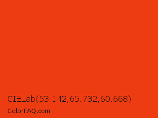 CIELab 53.142,65.732,60.668 Color is a normal red color and the nearest color is Pomegranate #f34723. Hex code #ed3b12 and RGB value is rgb(237,59,18). In RGB color space, this color is composed of 93% red, 23% green, 7% blue, In CMYK color space, this color is composed of 0% cyan, 75% magenta, 92% yellow , 7% black , In HSL color space, this color has a hue angle of 11° , 86% saturation and 50% lightness.