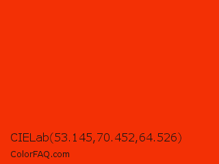 CIELab 53.145,70.452,64.526 Color is a normal red color and the nearest color is Coquelicot #ff3800. Hex code #f33005 and RGB value is rgb(243,48,5). In RGB color space, this color is composed of 95% red, 19% green, 2% blue, In CMYK color space, this color is composed of 0% cyan, 80% magenta, 98% yellow , 5% black , In HSL color space, this color has a hue angle of 11° , 96% saturation and 49% lightness.