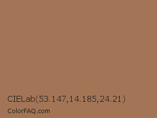 CIELab 53.147,14.185,24.21 Color is a normal orange color and the nearest color is Chamoisee #a0785a. Hex code #a37556 and RGB value is rgb(163,117,86). In RGB color space, this color is composed of 64% red, 46% green, 34% blue, In CMYK color space, this color is composed of 0% cyan, 28% magenta, 47% yellow , 36% black , In HSL color space, this color has a hue angle of 24° , 31% saturation and 49% lightness.
