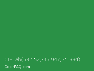 CIELab 53.152,-45.947,31.334 Color is a normal green color and the nearest color is Sea Green #2e8b57. Hex code #2a9146 and RGB value is rgb(42,145,70). In RGB color space, this color is composed of 16% red, 57% green, 27% blue, In CMYK color space, this color is composed of 71% cyan, 0% magenta, 52% yellow , 43% black , In HSL color space, this color has a hue angle of 136° , 55% saturation and 37% lightness.