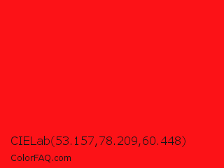 CIELab 53.157,78.209,60.448 Color is a normal red color and the nearest color is Vivid Red #f70d1a. Hex code #fc1217 and RGB value is rgb(252,18,23). In RGB color space, this color is composed of 99% red, 7% green, 9% blue, In CMYK color space, this color is composed of 0% cyan, 93% magenta, 91% yellow , 1% black , In HSL color space, this color has a hue angle of 359° , 98% saturation and 53% lightness.