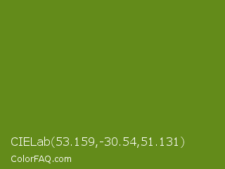 CIELab 53.159,-30.54,51.131 Color is a normal green color and the nearest color is Olive Drab #6b8e23. Hex code #638b1a and RGB value is rgb(99,139,26). In RGB color space, this color is composed of 39% red, 55% green, 10% blue, In CMYK color space, this color is composed of 29% cyan, 0% magenta, 81% yellow , 45% black , In HSL color space, this color has a hue angle of 81° , 68% saturation and 32% lightness.