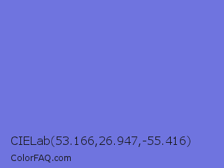 CIELab 53.166,26.947,-55.416 Color is a light blue color and the nearest color is Moody Blue #7f76d3. Hex code #6f74df and RGB value is rgb(111,116,223). In RGB color space, this color is composed of 44% red, 45% green, 87% blue, In CMYK color space, this color is composed of 50% cyan, 48% magenta, 0% yellow , 13% black , In HSL color space, this color has a hue angle of 237° , 64% saturation and 65% lightness.