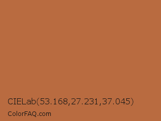 CIELab 53.168,27.231,37.045 Color is a normal orange color and the nearest color is Copper #b87333. Hex code #b96b40 and RGB value is rgb(185,107,64). In RGB color space, this color is composed of 73% red, 42% green, 25% blue, In CMYK color space, this color is composed of 0% cyan, 42% magenta, 65% yellow , 27% black , In HSL color space, this color has a hue angle of 21° , 49% saturation and 49% lightness.