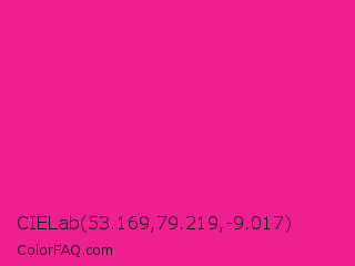 CIELab 53.169,79.219,-9.017 Color is a normal magenta color and the nearest color is Barbie Pink #e0218a. Hex code #ee1f91 and RGB value is rgb(238,31,145). In RGB color space, this color is composed of 93% red, 12% green, 57% blue, In CMYK color space, this color is composed of 0% cyan, 87% magenta, 39% yellow , 7% black , In HSL color space, this color has a hue angle of 327° , 86% saturation and 53% lightness.