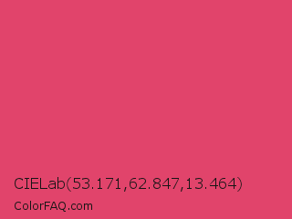 CIELab 53.171,62.847,13.464 Color is a normal red color and the nearest color is Cabaret #d94972. Hex code #e1446b and RGB value is rgb(225,68,107). In RGB color space, this color is composed of 88% red, 27% green, 42% blue, In CMYK color space, this color is composed of 0% cyan, 70% magenta, 52% yellow , 12% black , In HSL color space, this color has a hue angle of 345° , 72% saturation and 57% lightness.