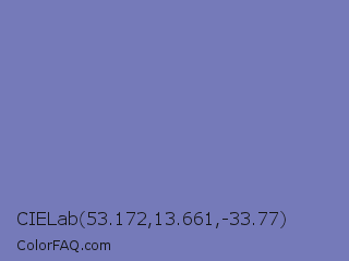 CIELab 53.172,13.661,-33.77 Color is a normal blue color and the nearest color is Toolbox #746cc0. Hex code #757ab9 and RGB value is rgb(117,122,185). In RGB color space, this color is composed of 46% red, 48% green, 73% blue, In CMYK color space, this color is composed of 37% cyan, 34% magenta, 0% yellow , 27% black , In HSL color space, this color has a hue angle of 236° , 33% saturation and 59% lightness.