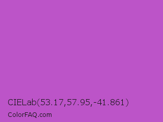 CIELab 53.17,57.95,-41.861 Color is a normal magenta color and the nearest color is Fuchsia Pink #c154c1. Hex code #bc54c8 and RGB value is rgb(188,84,200). In RGB color space, this color is composed of 74% red, 33% green, 78% blue, In CMYK color space, this color is composed of 6% cyan, 58% magenta, 0% yellow , 22% black , In HSL color space, this color has a hue angle of 294° , 51% saturation and 56% lightness.