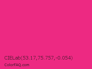 CIELab 53.17,75.757,-0.054 Color is a normal rose color and the nearest color is Barbie Pink #e0218a. Hex code #ed2982 and RGB value is rgb(237,41,130). In RGB color space, this color is composed of 93% red, 16% green, 51% blue, In CMYK color space, this color is composed of 0% cyan, 83% magenta, 45% yellow , 7% black , In HSL color space, this color has a hue angle of 333° , 84% saturation and 55% lightness.
